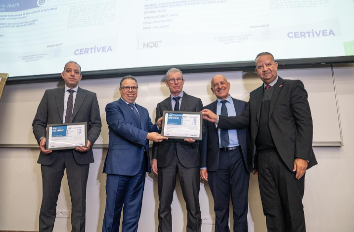 À l’occasion de la certification HQE (Haute Qualité Environnementale) de niveau « Exceptionnel » délivrée par CERTIVEA, une première au Maroc et en Afrique , la Fondation Mohammed VI des Sciences et de la Santé a organisé, le jeudi 29 janvier 2026 au sein du Complexe Hospitalo-Universitaire International Mohammed VI de Rabat, une cérémonie officielle de remise de deux certificats attribués à l’Hôpital Universitaire International Mohammed VI de Rabat et à l’Université Mohammed VI des Sciences et de la Santé de Rabat. Cette reconnaissance a été remise au Pr. Youns BJIJOU, Directeur Délégué de la Fondation Mohammed VI des Sciences et de la Santé (FM6SS). Elle affirme l’engagement du projet en matière de durabilité, de performance environnementale et d’intégration d’énergies renouvelables.